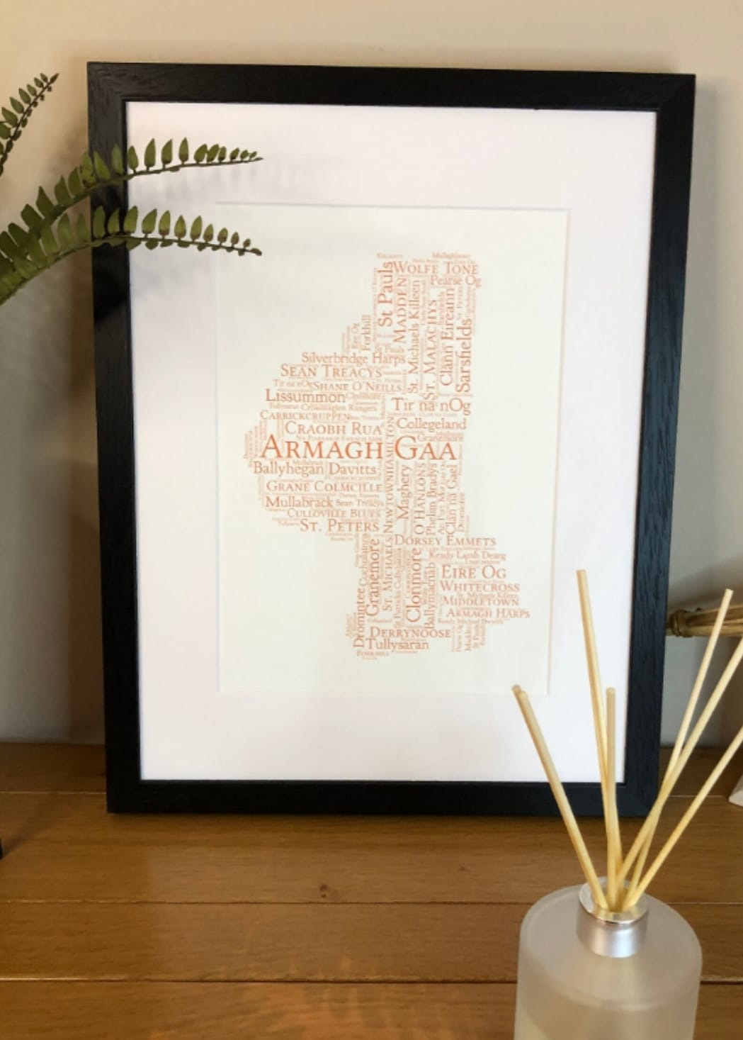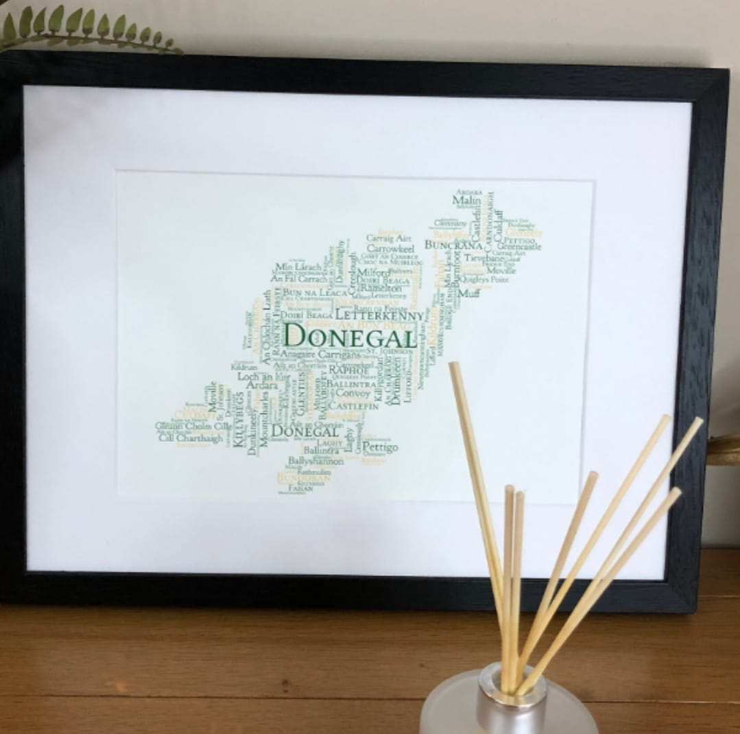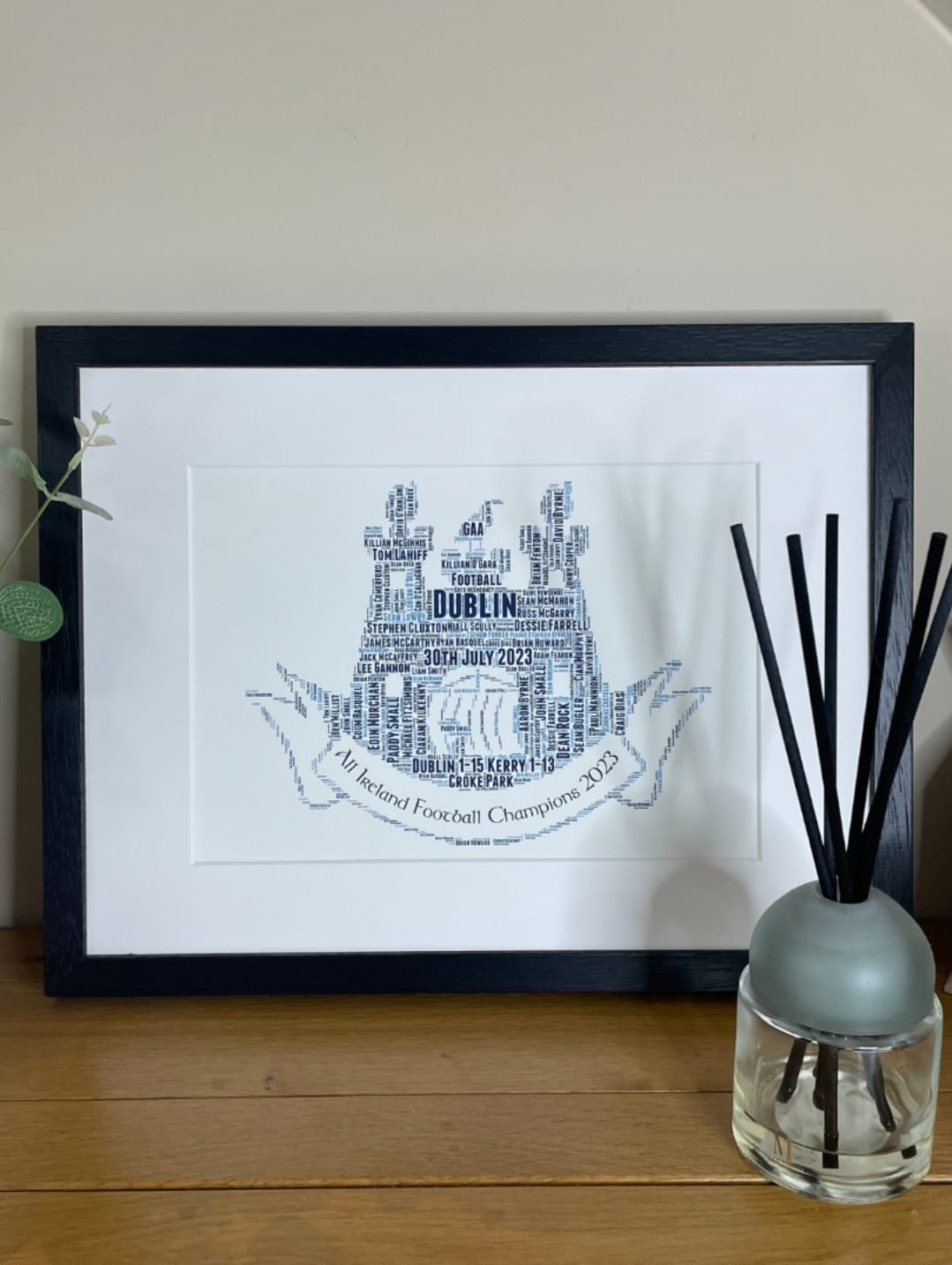 This product is framed in the dimensions of 422 x 335. 50mm white mount, framed in a black wood grain frame.